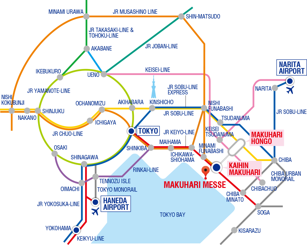 ● Approx. 40 minutes from Akihabara Station to Makuhari Hongo Station on the JR Sobu Line. 15 minutes by bus to Makuhari Messe.