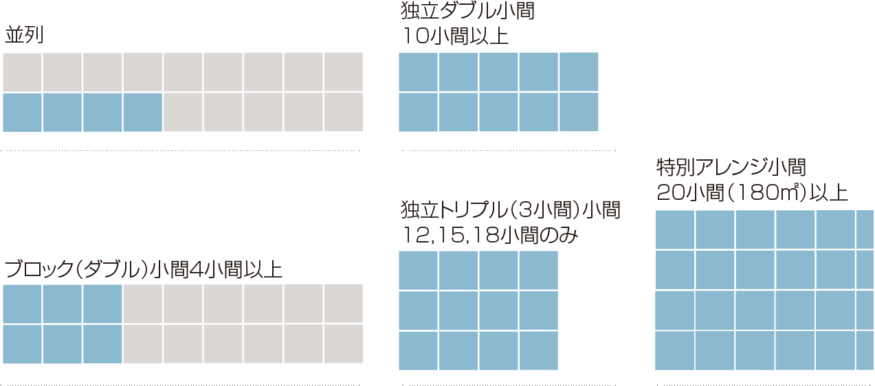 | 4~9小間 | 並列小間、ブロック小間より選択可能(高さ:4mまで使用可能 ※但し、並列小間は1mセットバック) |